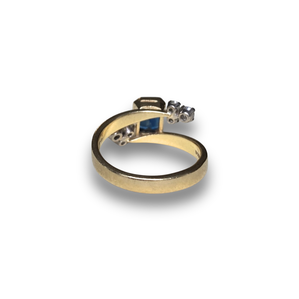 A striking 1980 sapphire and diamond ring crafted in 18K gold (marked and tested), featuring an elegant wrap-around design that combines vintage charm with contemporary style.