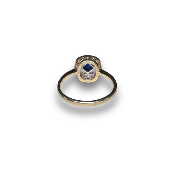 The ring features one square-cut blue sapphire (~0.14ct) at its centre, surrounded by a pavé diamond halo with an estimated total diamond weight of ~0.13ct, creating a bold yet elegant contrast between deep sapphire and sparkling diamonds. The detailed setting showcases the geometric elegance characteristic of the Art Deco style, updated with a modern finish for contemporary wear.