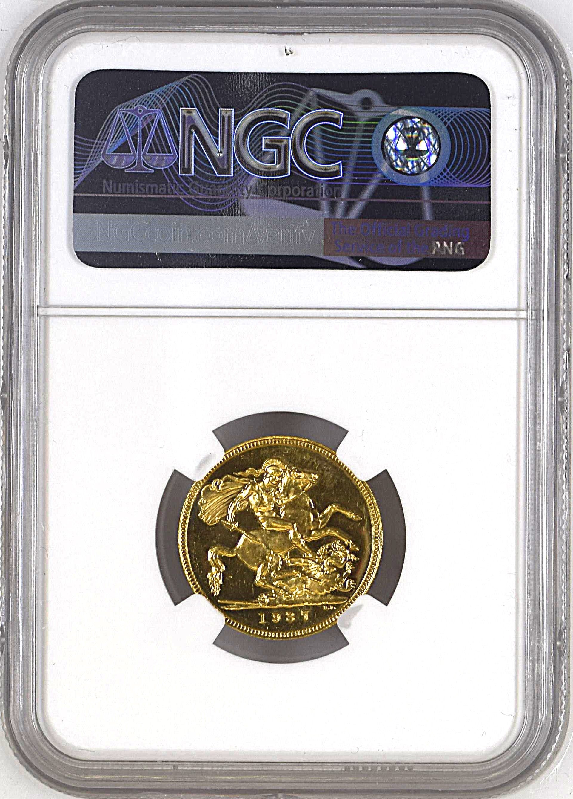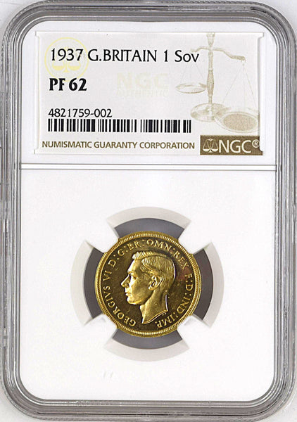George VI Coronation Proof Sovereign, 1937, London (W&R 439; S.4076), light handing marks in otherwise brilliant fields, one of only 5,001 struck, in NGC holder, graded NGC PF62 (Cert. #4821759-002)
