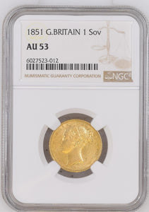 Victoria, 'Shieldback' Sovereign, 1851, Second Head, Normal Shield, London (Marsh 34; EGC II, 1097; Bentley 62; S.3852C), in NGC holder, graded NGC AU53 (Cert. #6027523-012)