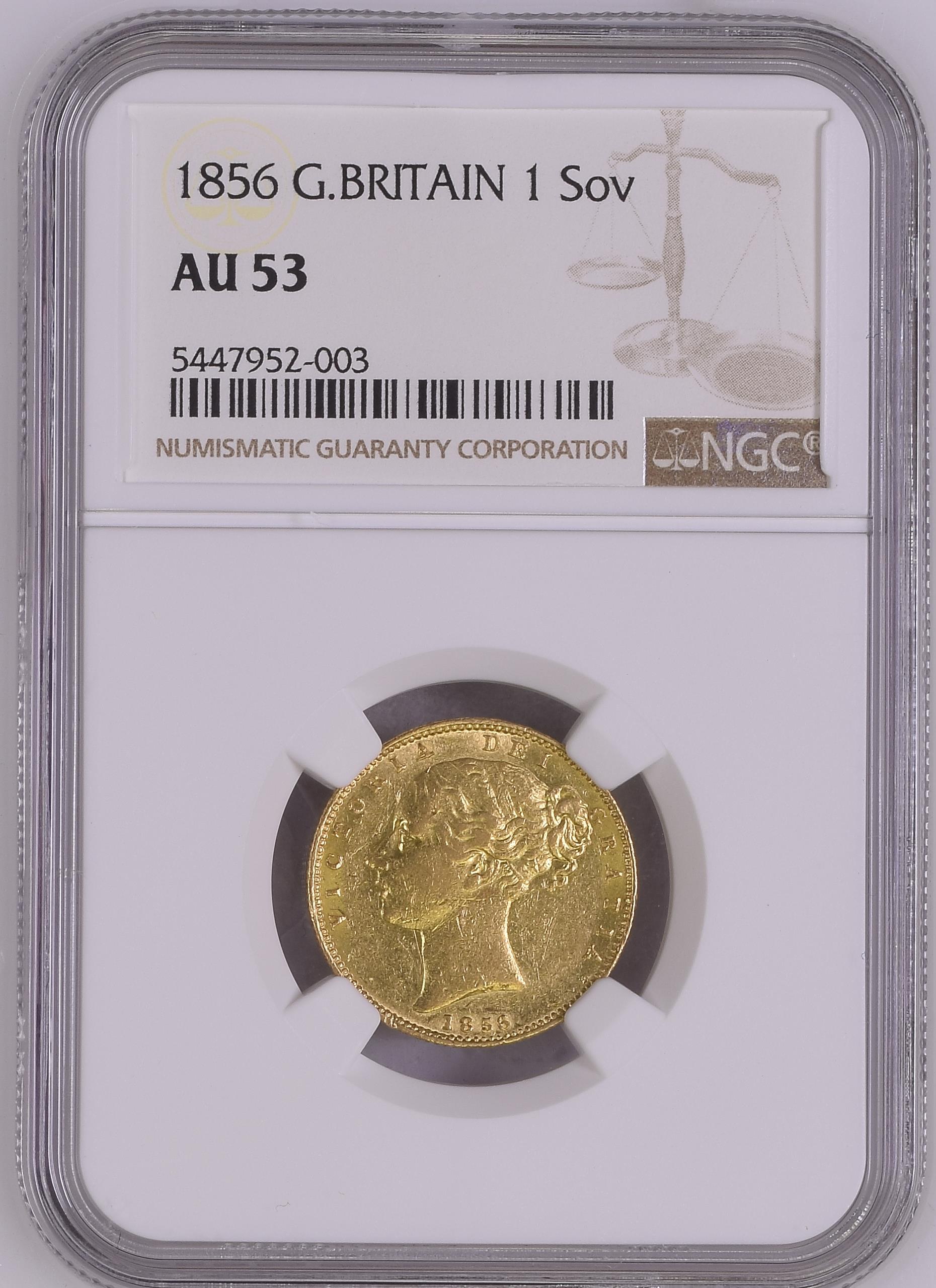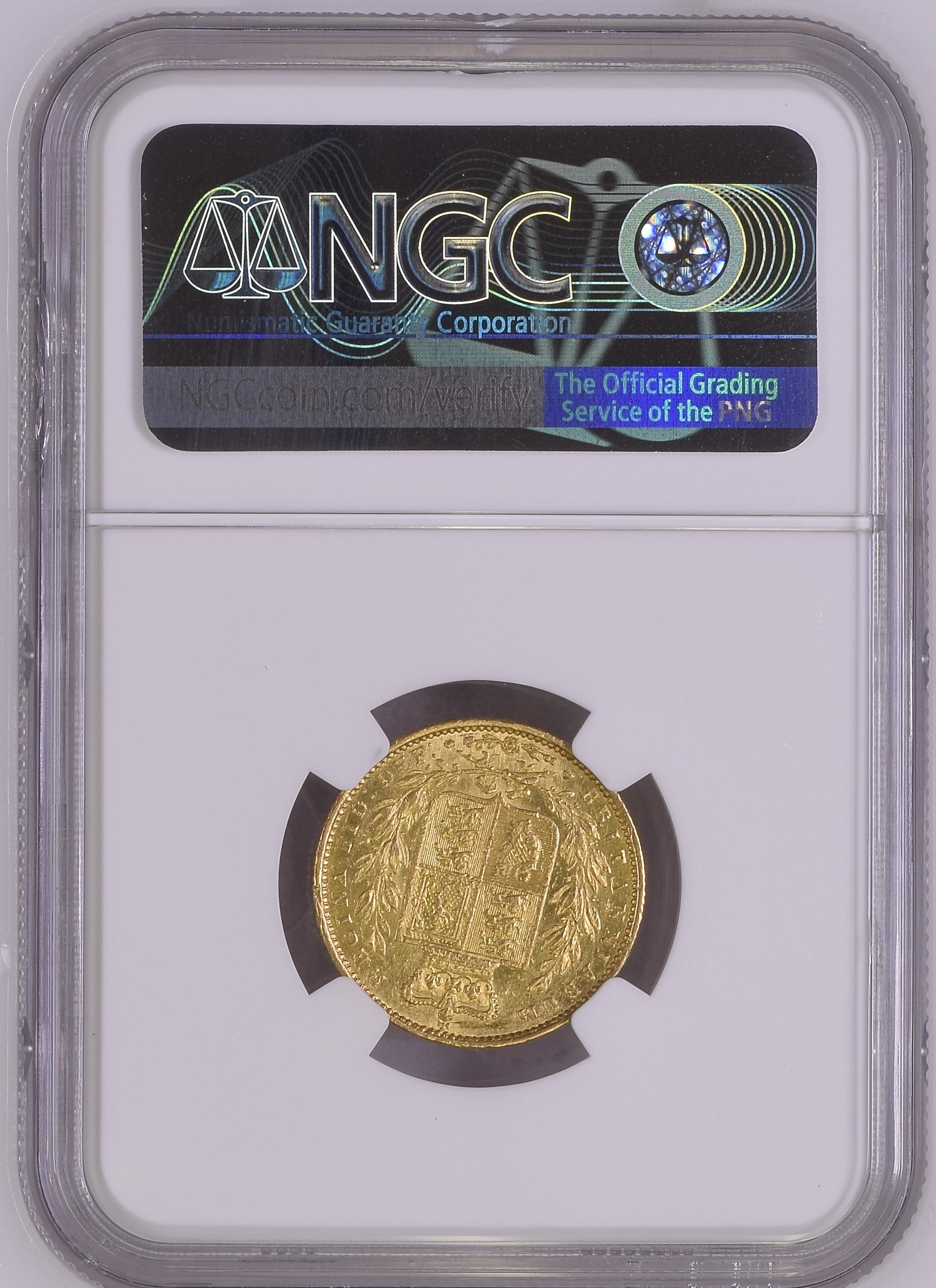 Victoria, 'Shieldback' Sovereign, 1856, Second Head, London (Hill 39; EGC II, 1120; cf. Bentley 75; S.3852D), in NGC holder, graded NGC AU53 (Cert. #5447952-003)