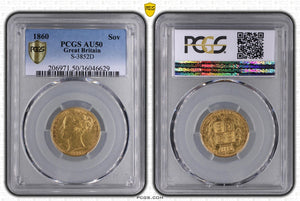 Victoria, 'Shieldback' Sovereign, 1860, Second Head, London (S.3852D), in PCGS holder, graded PCGS AU50 (Cert. #36046629)