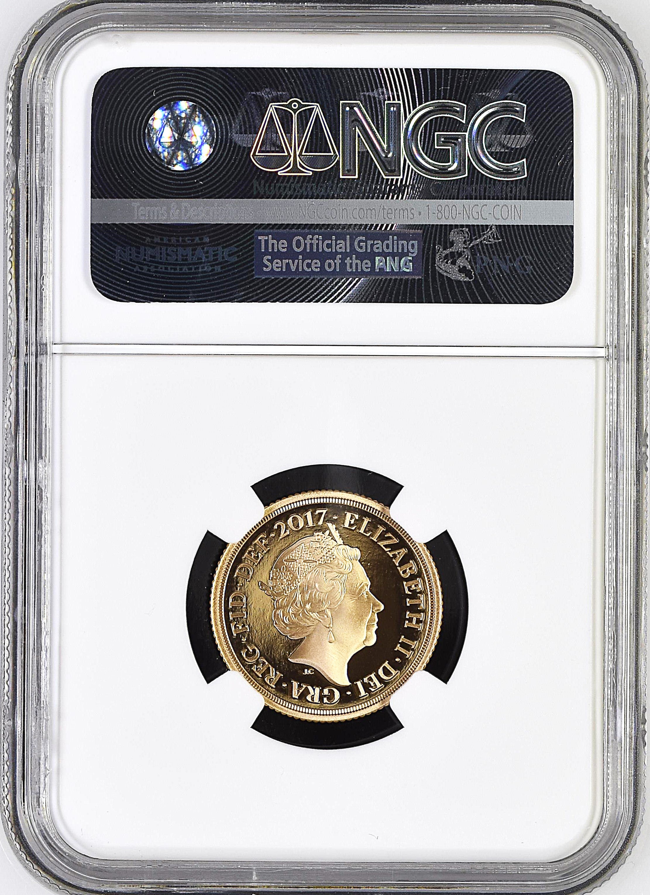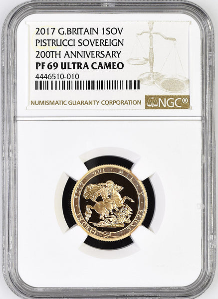 Elizabeth II, Commemorative Proof Sovereign, 2017, Llantrisant [Royal Mint], On the Bicentennial of the Modern Sovereign, by Jody Clark and Benedetto Pistrucci, edge milled, 7.98g*, 12h (S.SC11), brilliant, in NGC holder, graded NGC PF69 UCAM (Cert. #4446510-010)