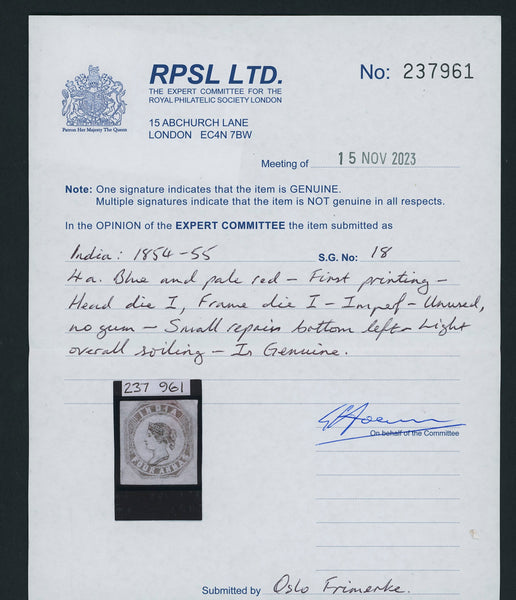 1st Printing, Head Die I, Frame Die I 4a. blue and pale red, cut-square, with large margins on three sides and just touching the frame at top; very small expert repair at lower left and some very faint soiling, unused without gum, a fine example of this very rare first printing. R.P.S. Certificate (2023). S.G. 18, £35,000